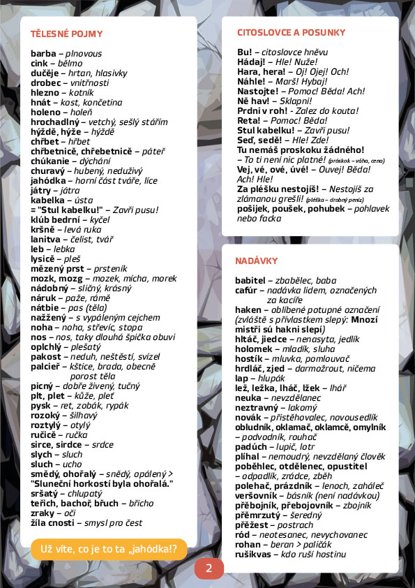 Historie je plná různých slov, která se nám mohou zdát až nesmyslná, například víte, co znamená věta: „Hlásní pozední říkal, že Jan Žižka má barbar až na jahódce?“ Zajímá vás, co nás vedlo k tomu přestat tyto výrazy používat? Pojďme se společně naučit několik středověkých slov, která možná používali i husitští bojovníci. Ti starší se mohou přiučit tomu, jak složitou cestu čeština musela ujít, než se ustálila do podoby, jakou známe dnes. A že to byla cesta! Věděli jste, že nejstarší předpísemné období datujeme už do 10. století? V příloze naleznete nejen slovník, ale také historická fakta a zajímavosti.